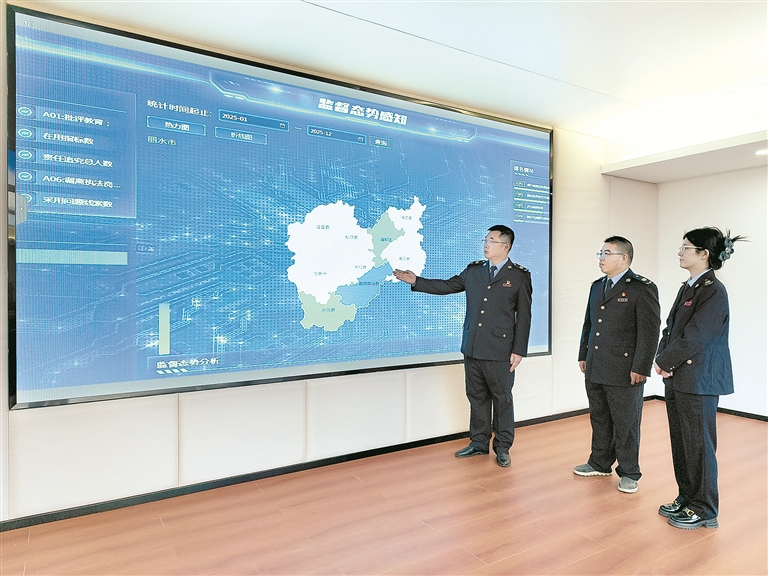 中央纪委国家监委驻国家税务总局纪检监察组推动税务总局将300多项税务执法风险监管规则嵌入税费征管信息系统,全程实时监控,阻断权力运行异动,对外促进企业合规经营,对内规范干部用权。图为近日,国家税务总局丽水市税务局党委纪检组干部运用全国税务系统公权力大数据监督平台开展日常监督,对预警信息加强分析研判。 田利彪 摄